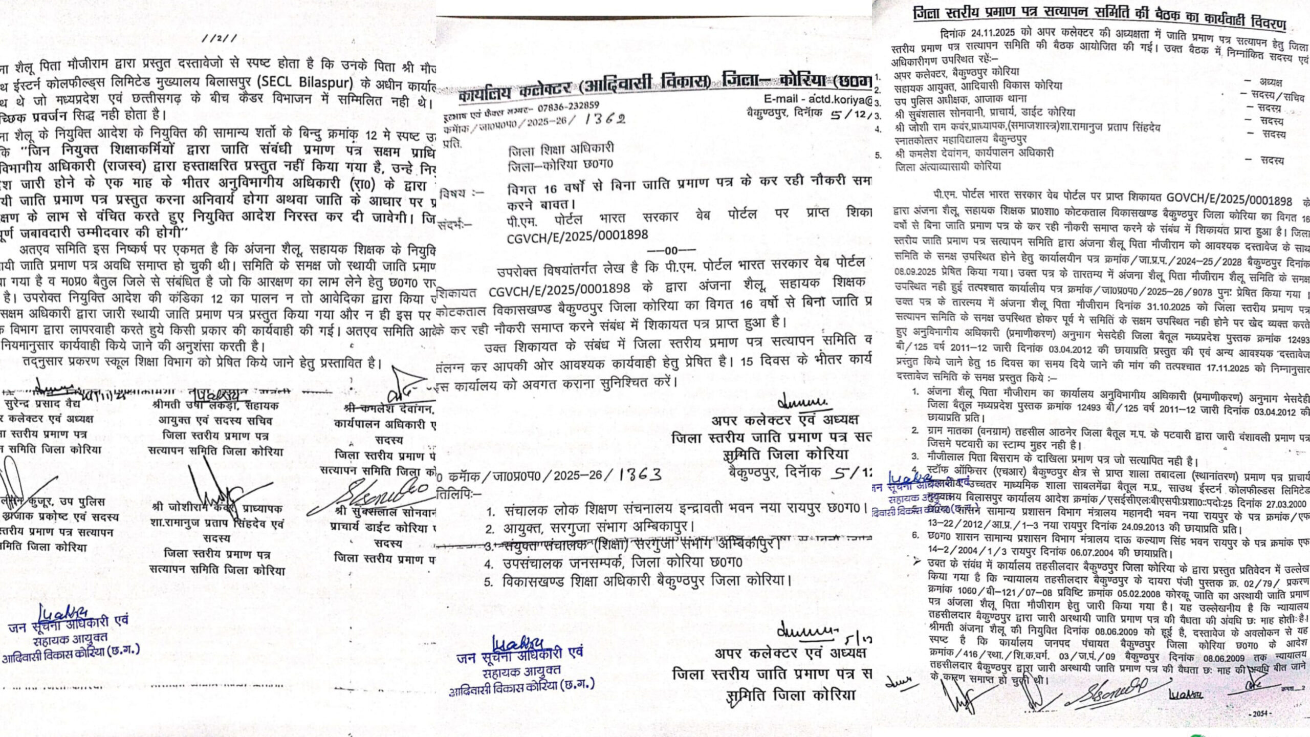 जिला कोरिया में सहायक शिक्षिका अंजना शैलू के विरुद्ध जाति प्रमाण पत्र को लेकर बड़ा प्रशासनिक मामला सामने आया है। पी.एम. पोर्टल पर प्राप्त शिकायत के बाद जिला स्तरीय जाति प्रमाण पत्र सत्यापन समिति ने जांच में पाया कि संबंधित शिक्षिका पिछले लगभग 16 वर्षों से बिना छत्तीसगढ़ राज्य द्वारा जारी वैध स्थायी जाति प्रमाण पत्र के शासकीय सेवा में कार्यरत हैं। इस खुलासे के बाद पूरे शिक्षा विभाग में हड़कंप की स्थिति निर्मित हो गई है।
