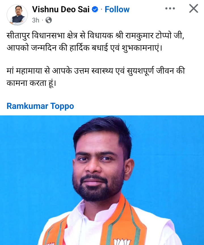 “मैं सीतापुर के लोकप्रिय विधायक रामकुमार टोप्पो जी को जन्मदिन की हार्दिक शुभकामनाएं देता हूं। मां महामाया से प्रार्थना करता हूं कि वे सदैव स्वस्थ रहें, दीर्घायु हों और जनसेवा के अपने संकल्प को नई ऊँचाइयों तक ले जाएं।”
