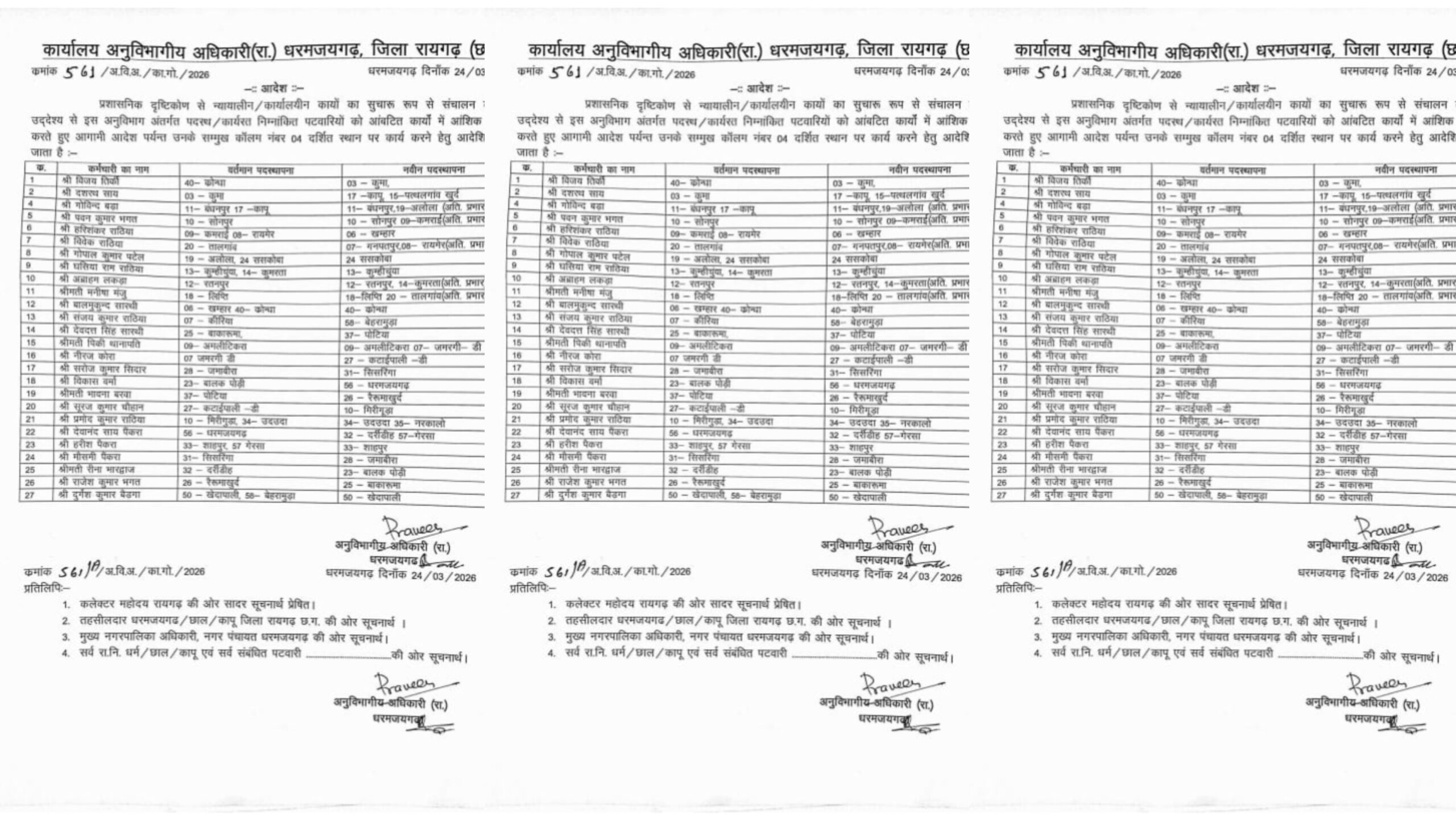 धरमजयगढ़ में राजस्व विभाग का बड़ा फेरबदल: 27 पटवारियों का तबादला, प्रशासनिक व्यवस्था मजबूत करने की कवायद